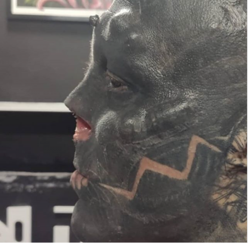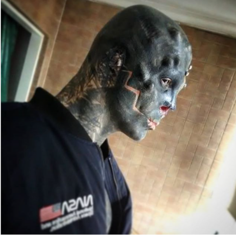 Hasta el momento, Loffredo, de 31 años, se ha tatuado toda la piel de negro, se puso implantes en la cabeza, se quitó las orejas y nariz, agregó piercings en la cara, se cortó la lengua en dos, entre muchos cambios más. “The Black Alien Project Evolution”, así fue titulada la transformación de hombre a extraterrestre por el mismo Anthony Loffredo.