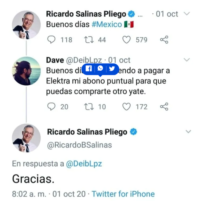 Muy bien señor Salinas, yo también me levanto sintiéndome muy bien al enterarme de que Elektra, deberá pagar al SAT ¡más de 2 mil MDP!, siga descansando y que se reponga pronto del Covid-19, para que pueda firmar el chequesin al SAT", escribió un usuario.