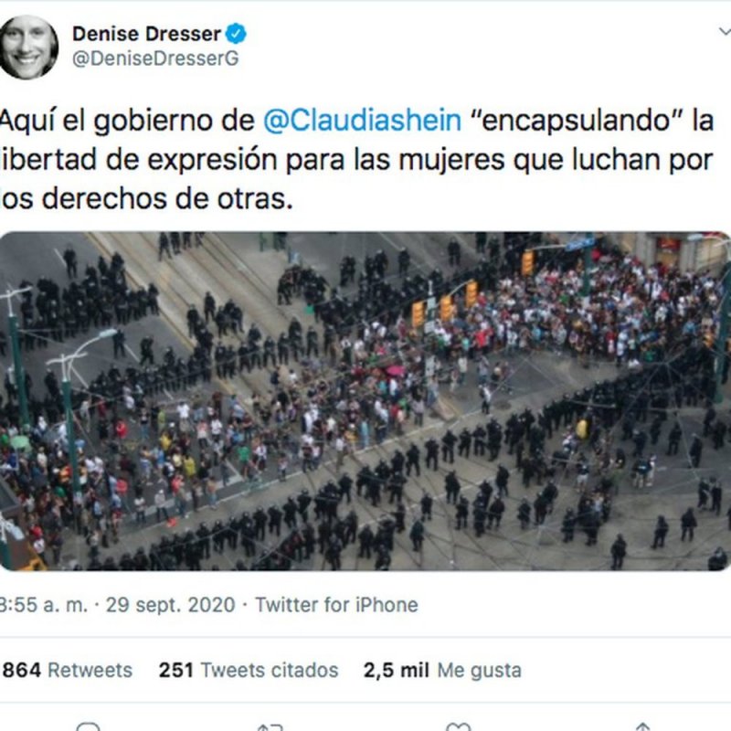 La mañana de este martes, Dresser publicó una imagen en su cuenta de Twitter en donde se podía ver a cientos de policías tapando el camino de manifestantes junto al mensaje: “Aquí el gobierno de Claudia Sheinbaum ‘encapsulando’ la libertad de expresión para las mujeres que luchan por los derechos de otras”.