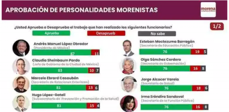 Una encuesta de EnKoll para el medio digital La Silla Rota, reveló que entre los funcionarios que cuentan con una alta aprobación entre los simpatizantes de Morena, destaca en primer lugar el presidente Andrés Manuel López Obrador (AMLO) con un 87 por ciento; le sigue la jefa de Gobierno de la Ciudad de México, Claudia Sheinbaum con 83 por ciento; el canciller Marcelo Ebrard y el subsecretario de Salud, Hugo López-Gatell, ambos con una aceptación del 81 por ciento.