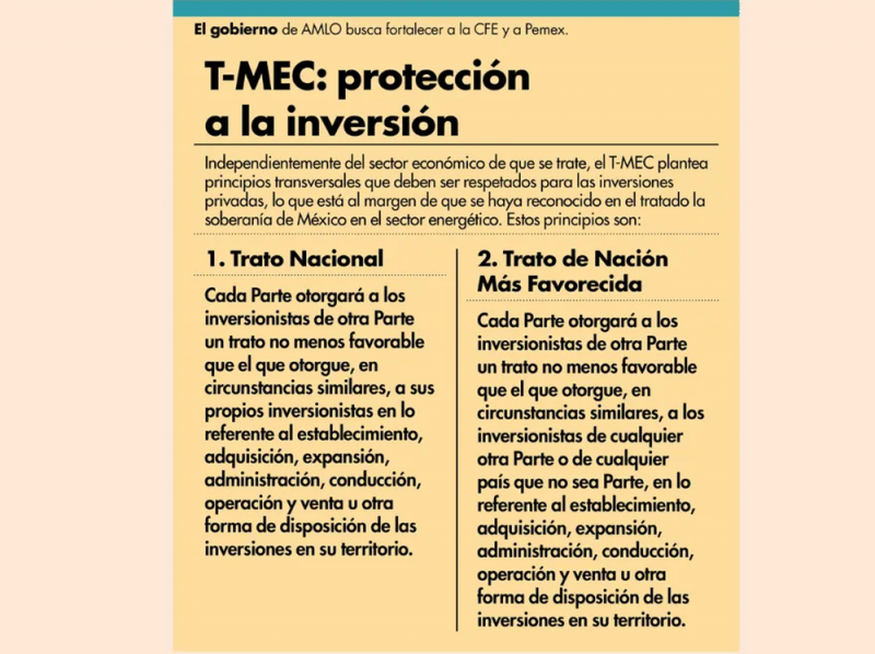 En términos generales, el gobierno de México no puede dar ventajas a Pemex o la CFE que impliquen una discriminación relacionada con el comercio exterior en América del Norte o un inversionista establecido en Canadá o Estados Unidos.