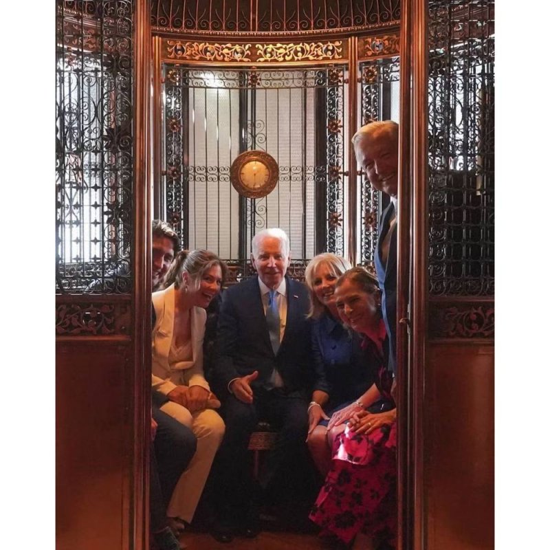 En la imagen se ve a Justin Trudeau y su esposa Sophie Grégoire del lado izquierdo; a Joe Biden y Jill Biden en el centro; y a Beatriz Gutiérrez y a AMLO del lado derecho; todos sonrientes al posar para la foto en el elevador.