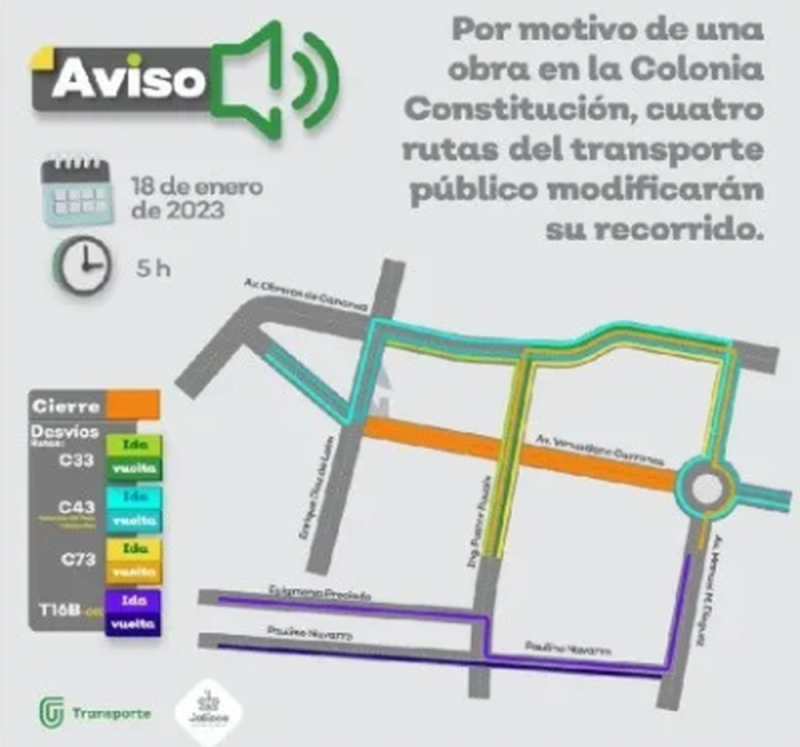 Se cerrará la Avenida Venustiano Carranza, en el tramo de Avenida Enrique Díaz de León a Avenida Manuel M. Diéguez, por lo que las rutas C33, C43 Haciendas del Valle y Valdepeñas, C73 y T16B-C02 cambiarán su derrotero.