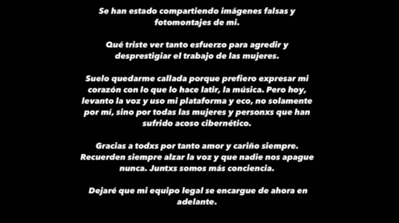 “Se han estado compartiendo imágenes falsas y fotomontajes de mi. Que triste ver tanto esfuerzo para agredir y desprestigiar el trabajo de las mujeres”, escribió en su cuenta de Instagram.