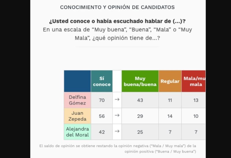 Además, la encuesta muestra que Gómez es la aspirante más popular, con un 70% de reconocimiento de nombre, le sigue Zepeda, con 56% y, finalmente, la precandidata de la coalición PRI-PAN.PRD, del Moral, con 42%.