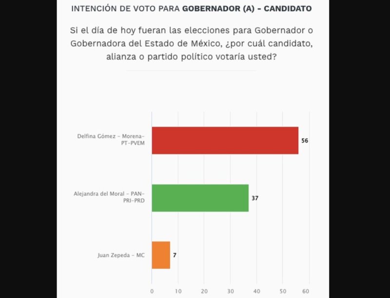 La segunda encuesta en vivienda de Enkoll para El Universal revela que si el día de hoy fueran las elecciones, 56% de los mexiquenses votaría por Gómez, 37% por Del Moral y apenas un 7% por Zepeda.