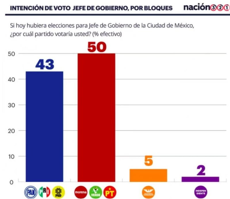 Morena y sus aliados lideran las encuestas rumbo a la elección capitalina de 2024, en la que se elegirá a la nueva Jefatura de Gobierno de la Ciudad de México en sustitución de Claudia Sheinbaum Pardo. Por 7 puntos porcentuales aventaja a PRI, PAN y PRD de la alianza Va por México.