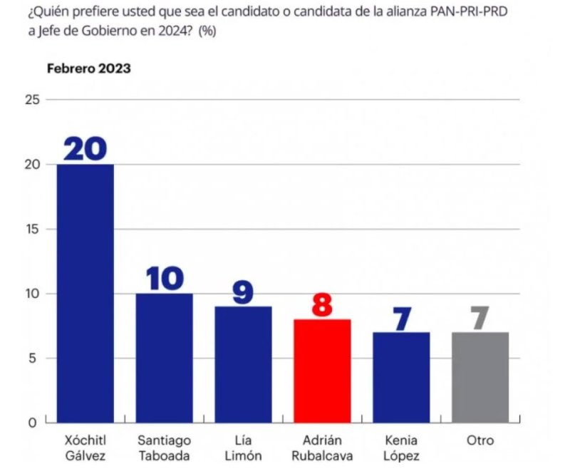 Por su parte, la oposición es liderada por la senadora del PAN Xóchitl Gálvez, a quien prefiere el 20% de los encuestados; seguida de Santiago Taboada, alcalde de Benito Juárez, con 10% de las preferencias; y Lía Limón, alcalde de Álvaro Obregón, con el 9%, ambos panistas. Solo un priista figura en los resultados: Andrián Ruvalcaba, alcalde de Cuajimalpa con 8%.
