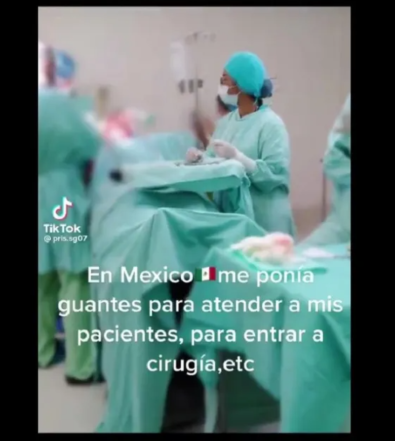 En las primeras fotografías se le puede ver adentro del quirófano o utilizando un uniforme blanco junto a sus colegas, mientras que en la segunda parte del video mostró algunos productos de limpieza que sostenía con las manos y cómo limpiaba el lavamanos de un baño, además bromeó diciendo que en los dos países tenía que utilizar guantes.