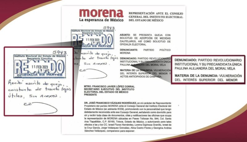 Horacio Duarte Olivares informó que MORENA ha presentado ante el Instituto Electoral del Estado de México (IEEM) 33 denuncias por diversos hechos atribuibles a Alejandra del Moral, del PRI, y al bloque que conforman junto al PAN, PRD y Partido Nueva Alianza, que constituyen actos anticipados de campaña, vulneración al interés superior de la niñez, uso indebido de programas sociales e infracciones en materia electoral, principalmente.