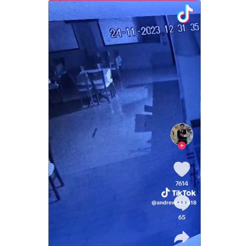 A través de la cámara de video vigilancia del restaurante se observa como el lugar está vacío, hasta que de pronto una sombra negra pasa muy cerca de un escritorio, lo que les resultó muy desconcertante, pero eso no es todo, desde otro ángulo en otra área, se alcanza a ver otra o quizá la misma sombra.