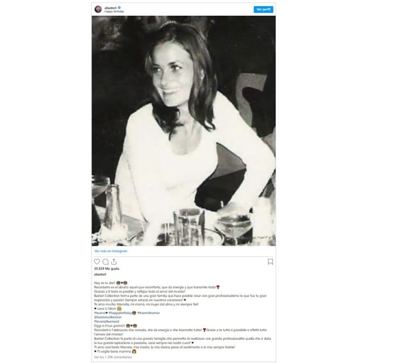 “¡¡Hoy es tu día!! Recordarte es el abrazo aquel que reconforta, que da energía y que transmite todo. Gracias a ti, todo es posible y reflejas todo el amor del mundo. (…) Siempre estarás en nuestros corazones! Te amo mucho Marcella, mi mamá, mi mujer del alma y mi siempre fiel”, escribió.