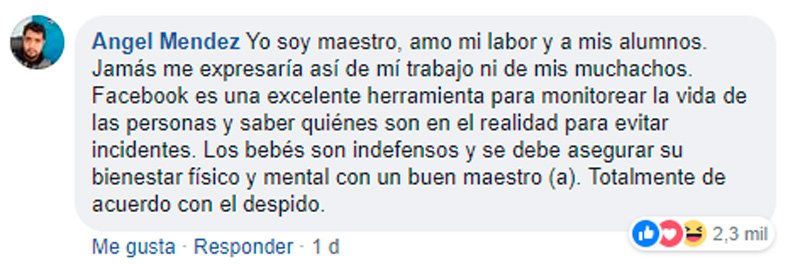 Para muestra, el usuario “FigDuqVicRom” escribió lo siguiente: “Gracias a dios ya fue despedida del plantel porque este tipo de persona no merece tener título de maestra. Ella era profesora de mi hija y qué bueno que ya no la tendremos que ver porque no sé si me iba a poder contener para con ella“.