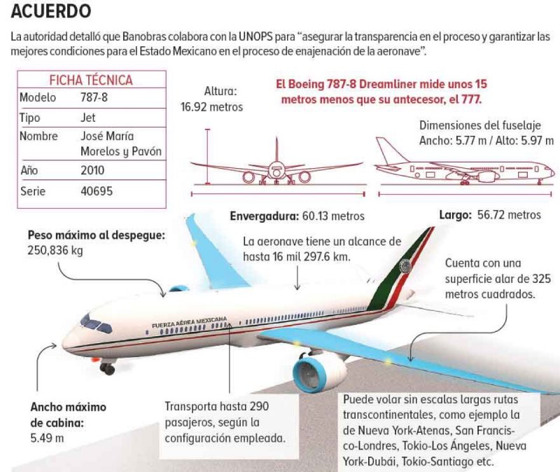 La Secretaría de Hacienda informó que inició el proceso formal para la enajenación del avión presidencial José María Morelos y Pavón, por lo que la Oficina de las Naciones Unidas de Servicios para Proyectos (UNOPS, por sus siglas en inglés) publicó la solicitud de expresión de interés dirigida a potenciales compradores.