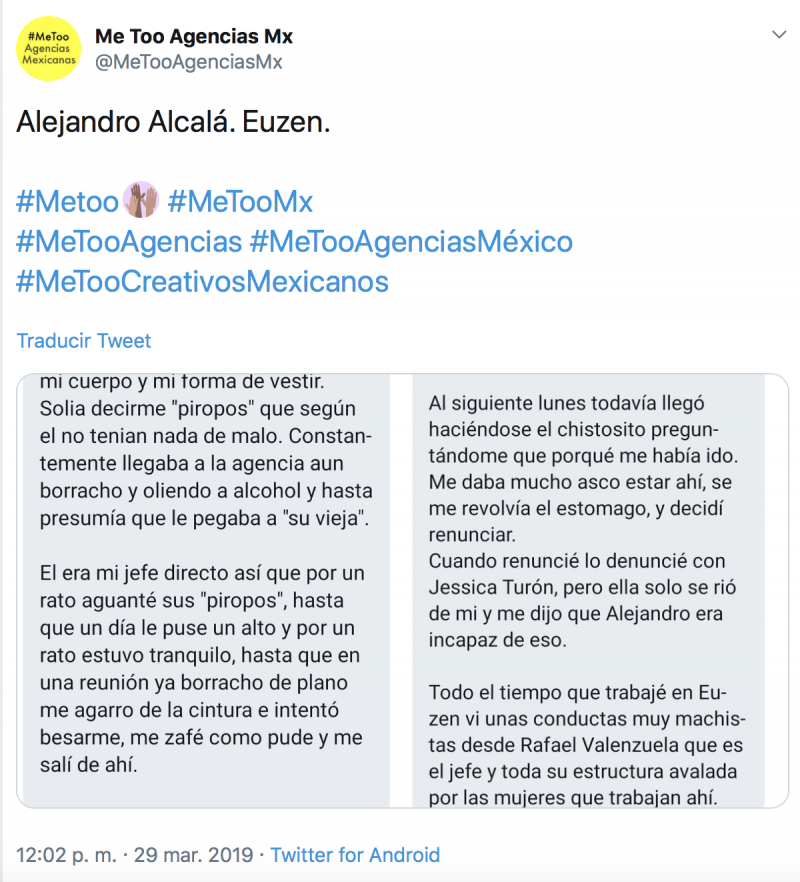 Trabajar en una empresa puede ser gratificante, pero cuando hay acoso laboral, la historia es otra y puede convertirse en la peor pesadilla de alguien, tal como le sucedió a una chica que hace unos días denunció a Alejandro Alcalá, jefe de diseñadores de la empresa Eu-Zen Consultores, quien al parecer es un patético acosador, alcoholico y hasta violento según denunció en twitter.
