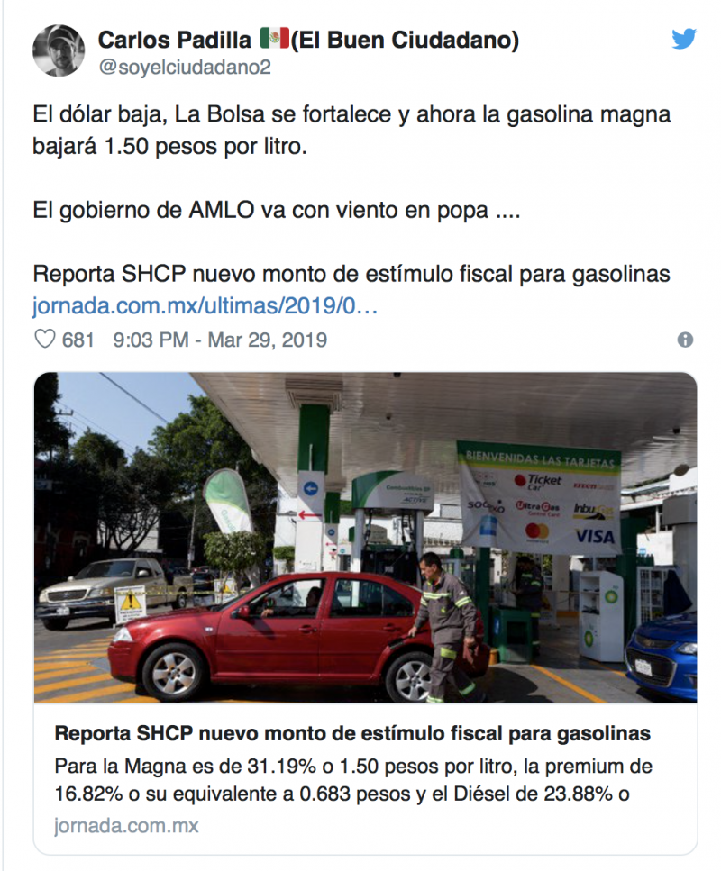 La semana pasada el Gobierno Federal anunció que a partir del próximo sábado el precio de la gasolina magna bajará 1.62 pesos, como parte del Impuesto Especial sobre Producción y Servicios (IEPS) por cada lt de combustible.