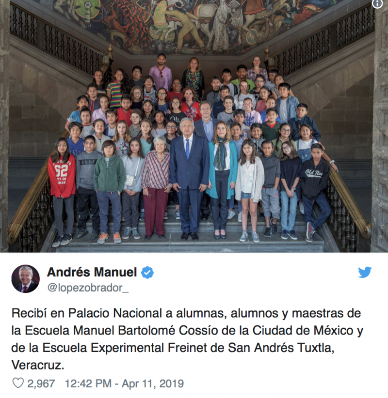 A través de un tuit el mandatario compartió las fotos del encuentro con los y las estudiantes de la escuela Manuel Bartolomé Cossío de la Ciudad de México y de la Escuela Experimental Freinet de San Andrés Tuxtla, Veracruz.
