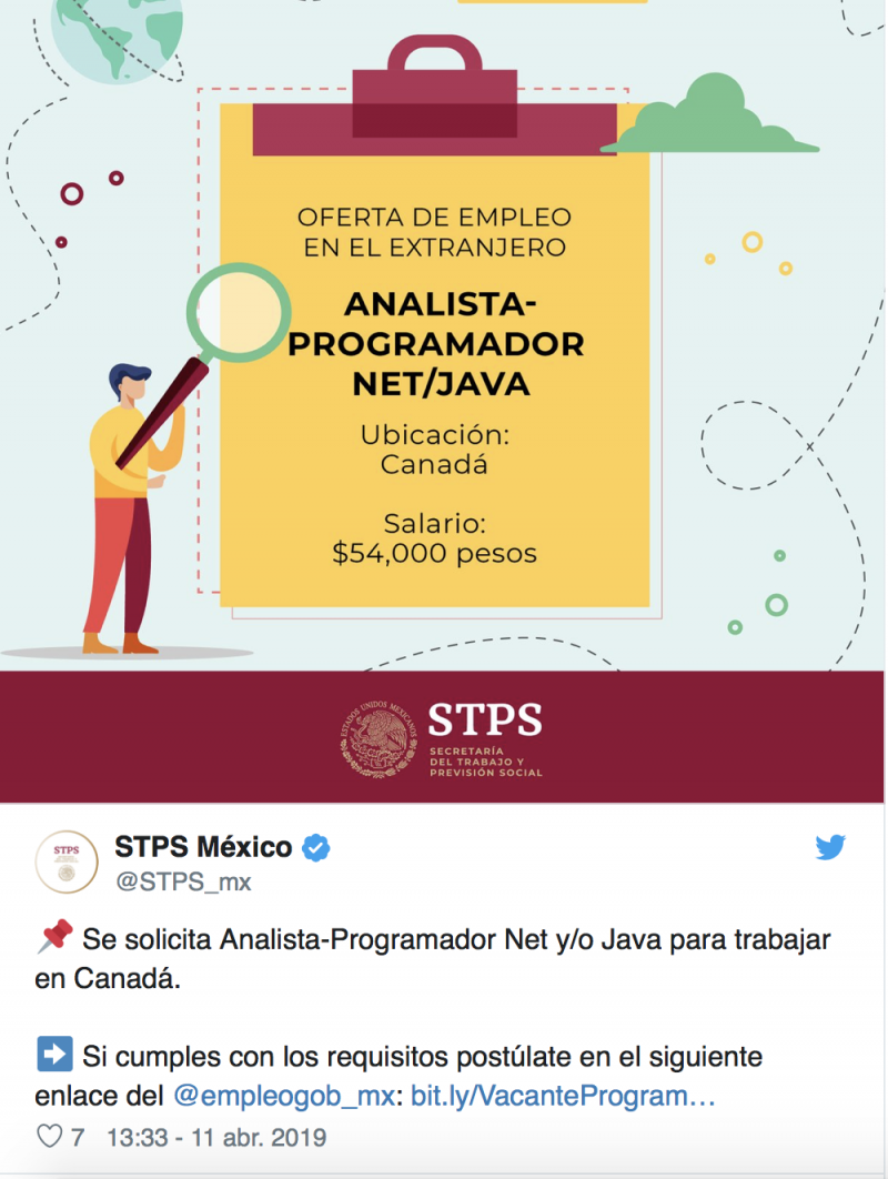 La Secretaría del Trabajo y Previsión Social (STPS) en sinergia con el gobierno de Canadá, solicitan Analista-Programador Net y/o Java para trabajar en el país norteamericano.