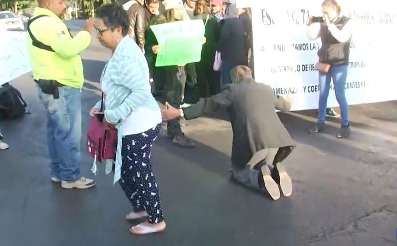 En Eje Cinco y Andrés Molina, un grupo de padres de familia decidió cortar la circulación vehicular para exigir la salida del director de la Secundaría 71. Los manifestantes se portaron inflexibles ante los automovilistas hasta que un hombre se arrodilló frente a ellos para suplicar que se quitaran.