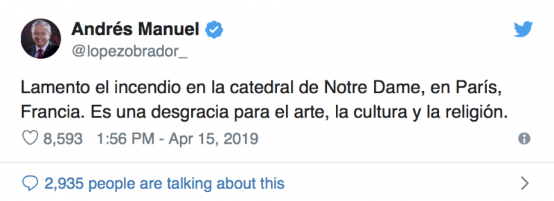 “Lamento el incendio en la catedral de Notre Dame, en París, Francia. Es una desgracia para el arte, la cultura y la religión”, escribió.