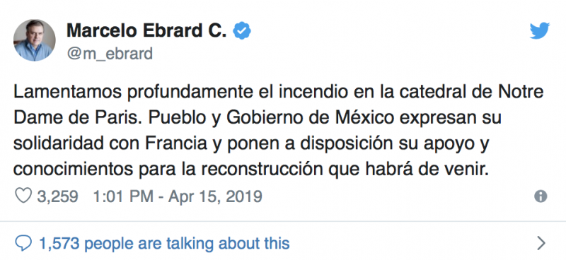 El titular de la Secretaría de Relaciones Exteriores (SRE) lamentó el incendio y externó su solidaridad y con ella, la de todos los mexicanos a Francia, además de ofrecer su apoyo y conocimiento para la reconstrucción del edificio.
