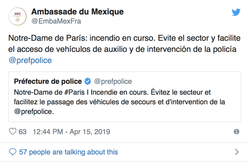 La Embajada de México en Francia había alertado también en su cuenta de Twitter sobre el “incendio en curso” en la catedral gótica parisina de 856 años de antigüedad, por lo que recomendó: evitar la zona y facilitar el acceso a los vehículos de emergencia.