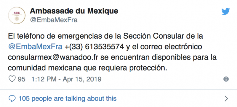 El teléfono de emergencias de la Sección Consular de la @EmbaMexFra +(33) 613535574 y el correo electrónico consularmex@wanadoo.fr se encuentran disponibles para la comunidad mexicana que requiera protección.
