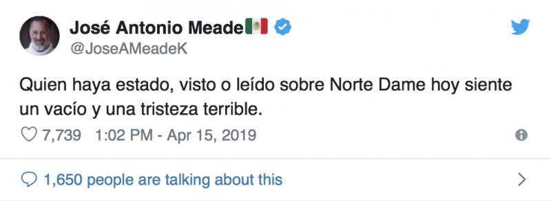 El excandidato presidencial del Partido Revolucionario Institucional (PRI), José Antonio Meade, se sumó a las condolencias alrededor del mundo por el incendio que consume la Catedral de Norte Dame en París, Francia, pero falló en escribir su nombre de manera correcta.