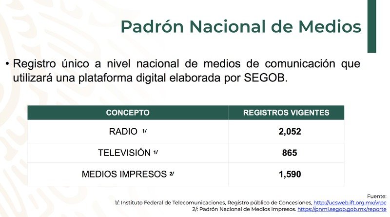 Jesús Ramírez detalló que en el país uno de los planteamientos es que no se cuenta con un padrón único de medios, y los registros que se tienen al respecto son los datos recabados por el Instituto Federal de Telecomunicaciones (IFT) y la Secretaría de Gobernación, que reportan 2 mil 52 emisoras de radio, 865 estaciones de televisión y mil 590 medios impresos nacionales o locales.