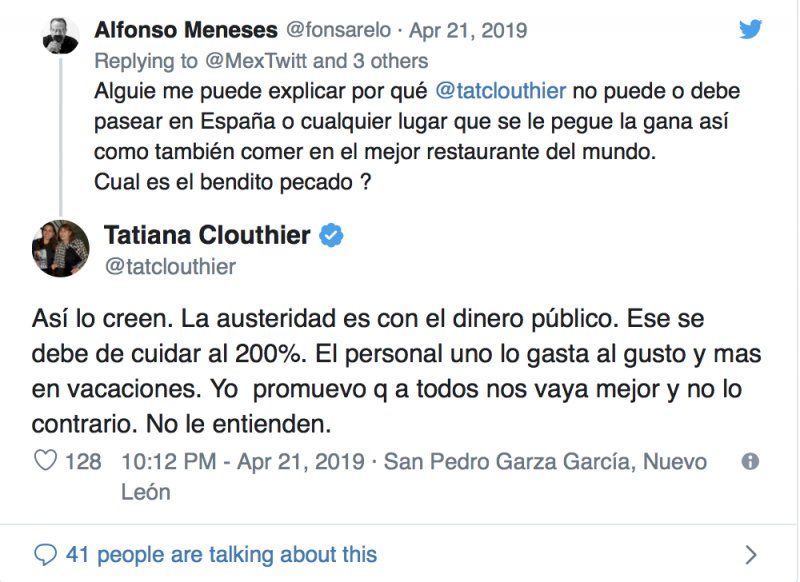 Al ser cuestionada en su cuenta de Twitter, la diputada respondió: “(...) La austeridad es con el dinero público. Ese se debe de cuidar al 200%. El personal uno lo gasta al gusto y más en vacaciones. Yo promuevo que a todos nos vaya mejor y no lo contrario. No le entienden”