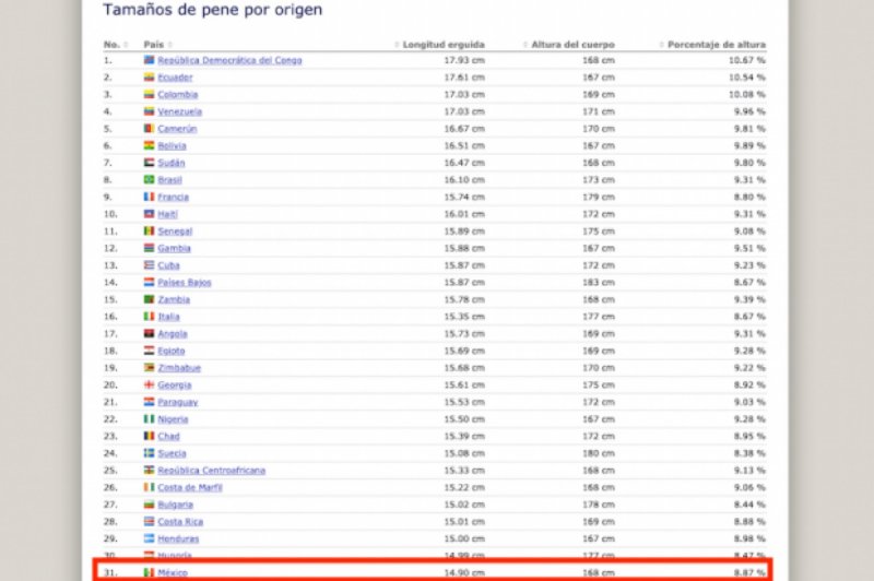 En cambio, los mexicanos aparecieron en el puesto 31 de la lista con 14,90 centímetros; arriba tiene a Hungría (14,99) y abajo a Austria (14,53). Pero antes de que se decepcionen es necesario explicar que, por ejemplo, los hombres de República Democrática del Congo, miden alrededor de 168 centímetros de altura, mientras que los mexicanos también. (Ok, no encontramos justificación).
