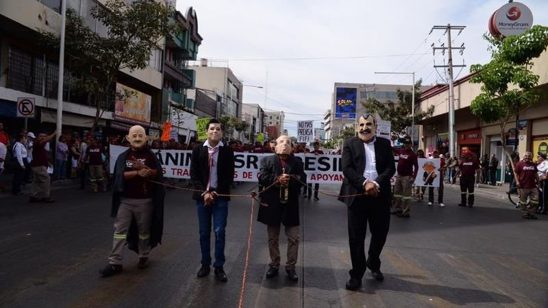 Durante la marcha que se llevó a cabo en la Centro de Culiacán, por la conmemoración del 1 de Mayo, Día del Trabajo, se captó a un doble de Lopéz Obrador que tenía detenidos a varios expresidentes de México con una cuerda.