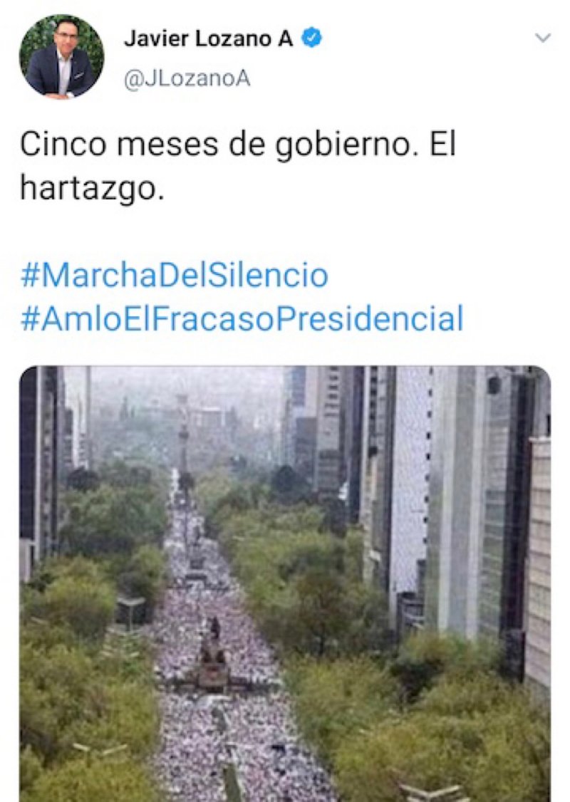 El ex senador de la República Javier Lozano y el escritor Francisco Martín Moreno compartieron en redes una imagen errónea sobre la marcha de este 5 de mayo en Paseo de la Reforma en contra del presidente Andrés Manuel López Obrador, a fin de mostrar una asistencia mucho mayor a la que realmente convocó el evento.