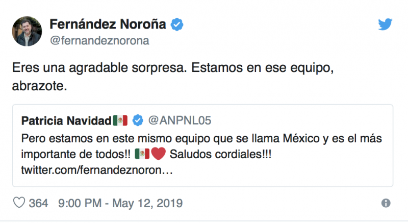 “Eres una agradable sorpresa. Estamos en ese equipo, abrazote”, escribió Noroña.