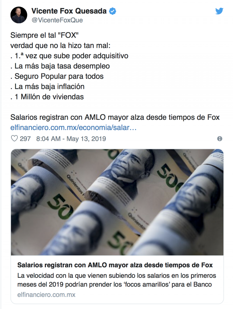 Por medio de Twitter, Vicente Fox compartió un artículo de El Financiero en el que se señala que los salarios registran, con la administración de López Obrador, mayor alza desde el periodo cuando el guanajuatense gobernó a la nación.