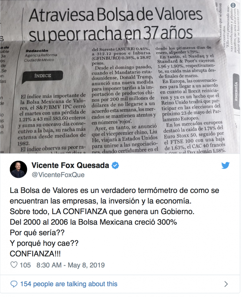 El pasado 8 de mayo Vicente Fox compartió una imagen en Twitter en la que se puede apreciar una nota del periódico Reforma en la que se detalla que la Bolsa Mexicana de Valores (BMV) está en crisis, pues atraviesa su peor racha en 37 años.