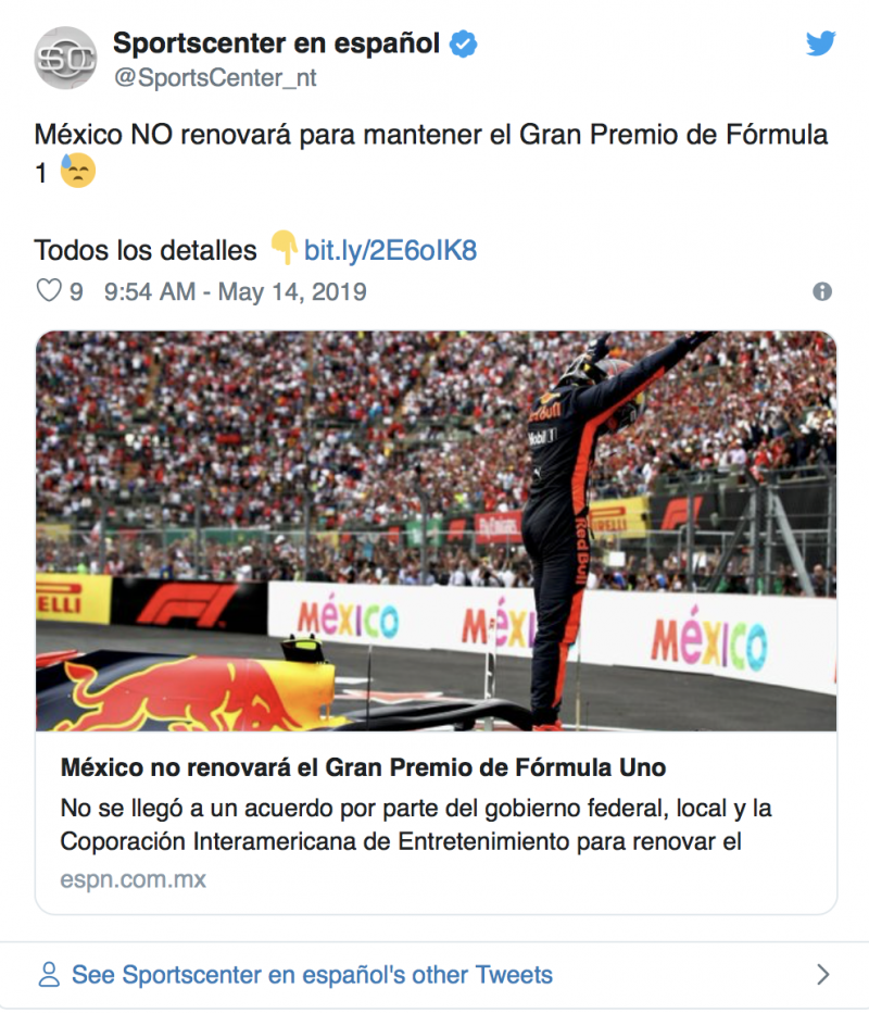 De acuerdo con información de ESPN, el Gran Premio de México terminará su tercera etapa en el país este 2019 después de que el gobierno federal, local y Corporación Interamericana de Entretenimiento (CIE) no llegaran a un acuerdo para renovar su contrato con Liberty Media, dueño de la Fórmula 1, aseguraron fuentes a ESPN.