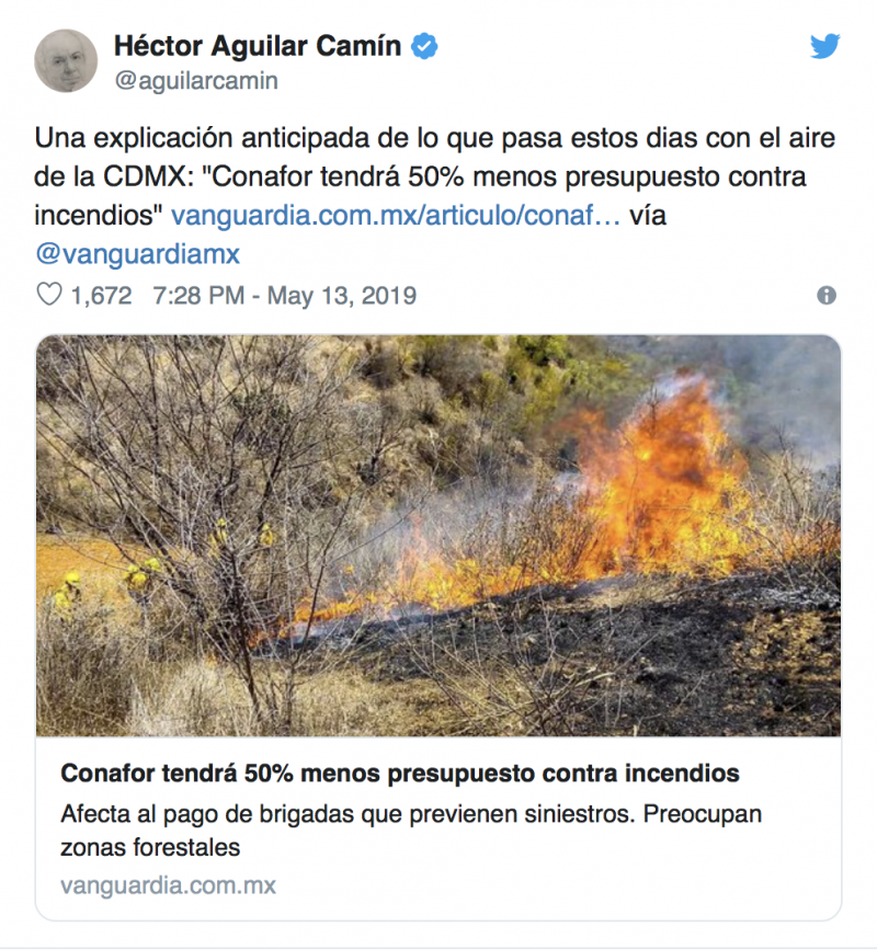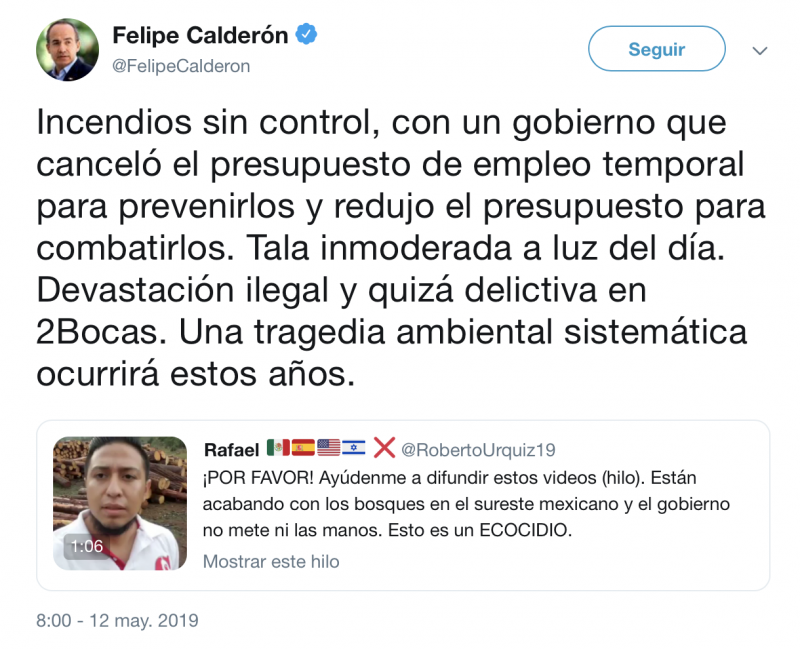 El expresidente Felipe Calderón ha sido uno de los principales detractores de López Obrador, y ha estado muy activo en su cuenta de Twitter desde el primer día en que ocurrió la contingencia ambiental a causa de los incendios forestales que se han registrado muy cerca de la capital.