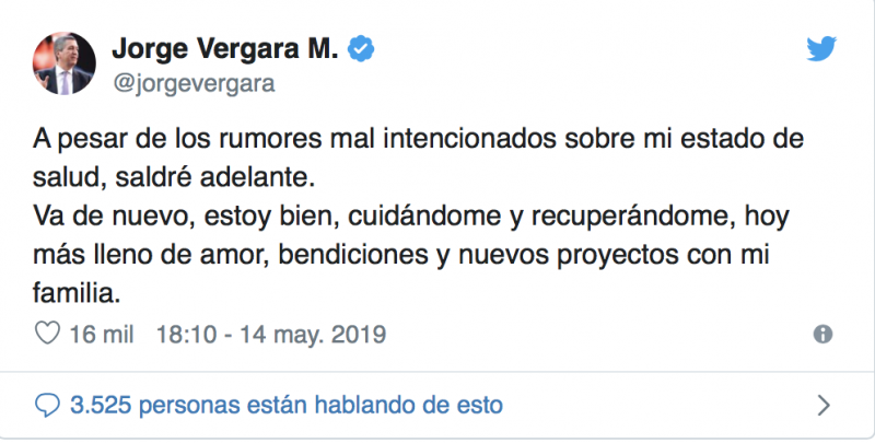 Jorge Vergara reapareció en su cuenta de Twitter para confirmar que se encuentra en un proceso de recuperación. Esto luego de que en redes sociales surgieran rumores de su fallecimiento, mismos que intentaron apagar los directivos de Chivas.