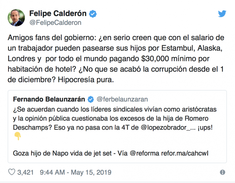 A través de su cuenta de Twitter, Calderón Hinojosa publicó: “Amigos fans del gobierno: ¿en serio creen que con el salario de un trabajador pueden pasearse sus hijos por Estambul, Alaska, Londres y  por todo el mundo pagando $30,000 mínimo por habitación de hotel? ¿No que se acabó la corrupción desde el 1 de diciembre? Hipocresía pura”.