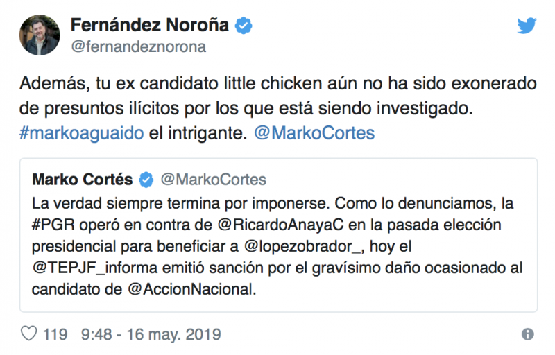 “Tu ex candidato little chicken aún no ha sido exonerado de presuntos ilícitos por los que está siendo investigado. #markoaguaido el intrigante. @MarkoCortes”, escribió Fernández Noroña a Marko Cortés.