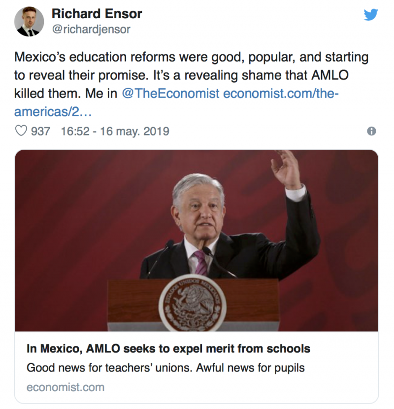 En un artículo publicado este jueves con el título "En México, AMLO busca expulsar al mérito de las escuelas", el medio internacional lamentó que AMLO optara por devolverle el poder de la educación mexicana a las organizaciones sindicales de profesores.