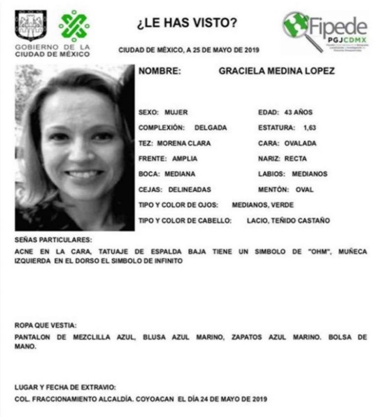Un terrible suceso se registró en la alcaldía Coyoacán, de la Ciudad de México, después de que se reportara la desaparición de una mujer llamada Graciela Medina López desde el viernes 24 de mayo del año en curso.