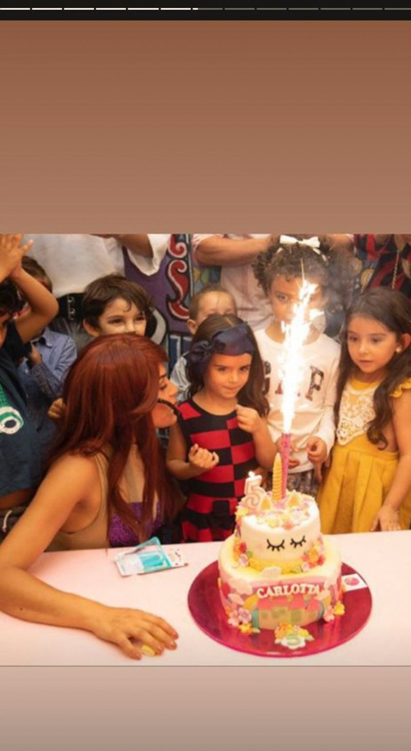 Acompañada de sus amiguitos y familiares, la pequeña Carlotta pidió sus deseos con un hermoso pastel de unicornio, además, lució un vestido igual al de su ahora famosa mamá, con franjas negro y rojo y ambas con zapatos en tono nude. La fiesta también tuvo la presencia de La Sirenta, personaje de Disney que se dio a la tarea de amenizar la celebración.