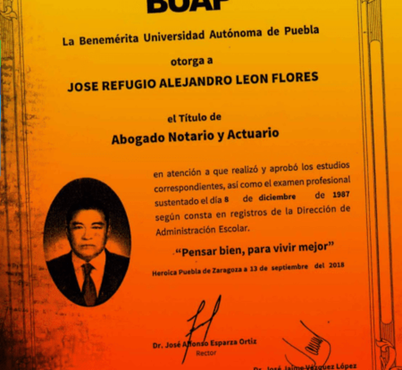 Finalmente, León Flores comenzó su trámite de titulación como licenciado en Derecho y obtuvo su título el 13 de septiembre de 2018, de acuerdo con información que la BUAP entregó atendiendo la resolución del tribunal colegiado mediante amparo.