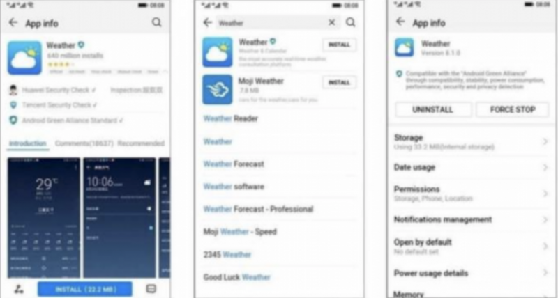 Las imágenes permiten conocer la forma en que se pueden configurar aplicaciones instaladas en un teléfono inteligente con el sistema operativo de la fabricante china, los cuales difieren significativamente del diseño en los teléfonos inteligentes Android actuales.