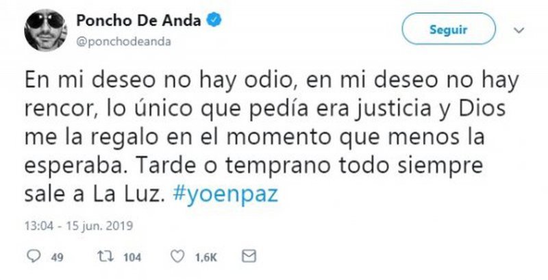 “En mi deseo no hay odio, en mi deseo no hay rencor, lo único que pedía era justicia y Dios me la regaló en el momento que menos la esperaba. Tarde o temprano todo siempre sale a La Luz. #yoenpaz”.