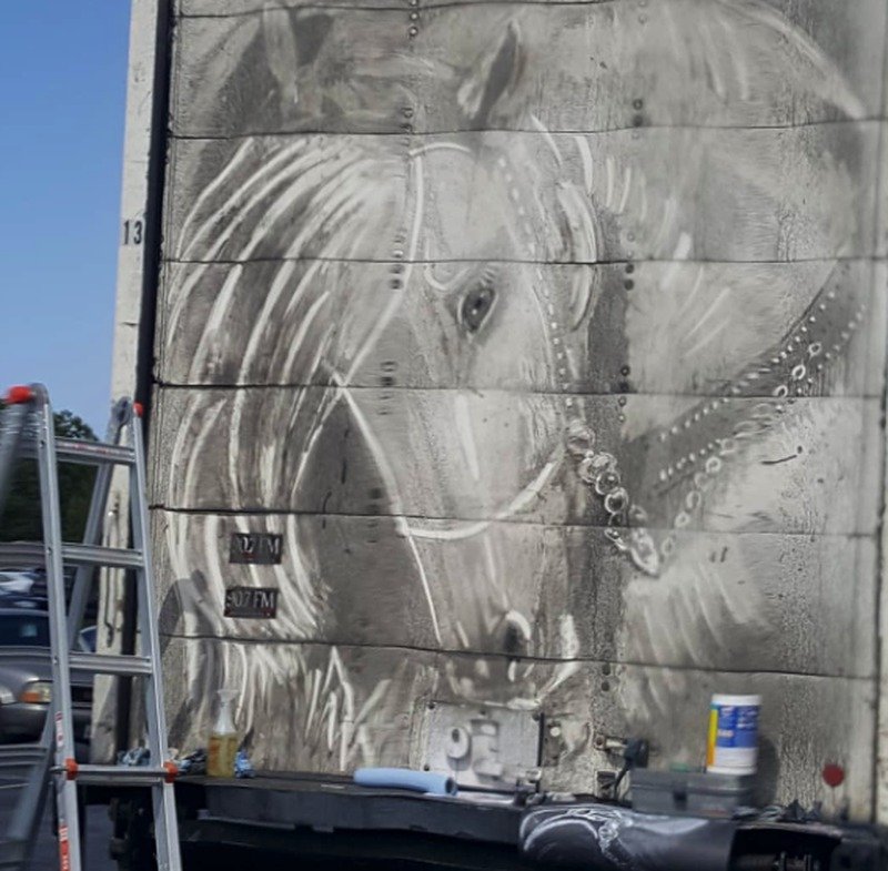 El primer retrato gigante que hizo en la puerta trasera de su "troca" de transporte de carga fue en el verano de 2016 y apostó por una mujer, su "musa", que desapareció al lavar el camión semanas después.