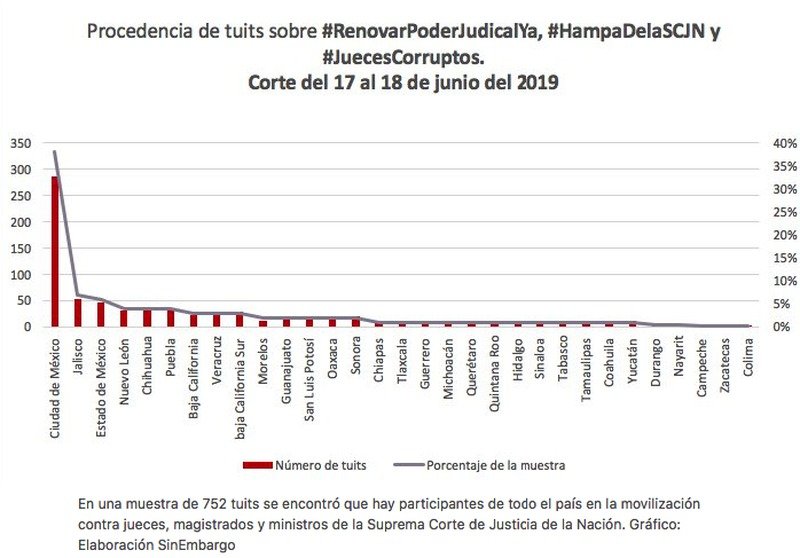 En una muestra generada a partir de tuits en los que se emplearon las etiquetas #HampaDeLaSCJN, #RenovarPoderJudicalYa y #JuecesCorruptos, un MetaDato originado –a partir de las localidades que indicaron los usuarios en sus perfiles– muestra que estas etiquetas no sólo están interconectadas, sino que también articulan una movilización que brota en todos los estados del país y con mayor incidencia en entidades como Ciudad de México, Jalisco, Estado de México, Chihuahua, Baja California, Baja California Sur , Puebla y Nuevo León.