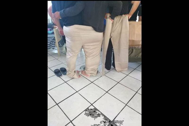De acuerdo con fotografías enviadas a varios medios de comunicación, los elementos del INM denunciaron que los uniformes entregados son tallas extra grandes y algunos de ellos tallas XXXG en las que se observa que dos personas entran en un sólo pantalón